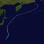 It was downgraded to a tropical storm and turned northeast before it slowed down. Hope became extratropical on August 17. Shortly after, the remnants hit the south of Kamchatka Peninsula and dissipated.