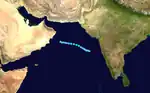 The first storm of the season originated from a tropical disturbance that formed east of Somalia on May 18. Over the following few days, the system gradually organized,[3] becoming a depression on May 21. It moved eastward toward the coastline of southwestern India and rapidly intensified on May 22, strengthening from a deep depression to a very severe cyclonic storm within 24 hours.[1] After approaching the coastline, the storm turned to the north and northwest away from land due to a ridge.[3] Based on the well-defined eye and the storm's satellite presentation,[1] the IMD estimated peak winds of 215 km/h (135 mph) on May 24, and the JTWC estimated 1 minute winds of 205 km/h (125 mph).[4] It became the strongest storm on record in the Arabian Sea, only to be surpassed by Cyclone Gonu in 2007.[5] Soon after reaching peak intensity, the cyclone rapidly weakened as it turned northward. By May 28, it had deteriorated into a deep depression, and the IMD downgraded the storm to a remnant low before the circulation reached the Gujarat coast.[4]