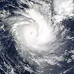 Satellite image of two simultaneous tropical cyclones, both with similar appearances.
