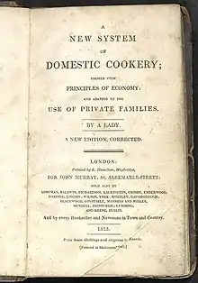 A New System of Domestic Cookery, first published in 1806 by Maria Rundell (1745 – 16 December 1828), was the most popular English cookbook of the first half of the nineteenth century; it is often referred to simply as "Mrs Rundell", but its full title is A New System of Domestic Cookery: Formed Upon Principles of Economy; and Adapted to the Use of Private Families.