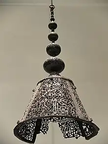 Carved stucco (or yesería in Spanish) and mosaic tilework (zilīj or zellij in Arabic;[lower-alpha 5] alicatado in Spanish[103]) were used for wall decoration, while ceilings were generally made in wood, which could be carved and painted in turn. Tile mosaics and wooden ceilings often feature geometric motifs. Tilework was generally used for lower walls or for floors, while stucco was used for upper zones.[90] Stucco was typically carved with vegetal arabesque motifs (ataurique in Spanish, from Arabic: التوريق, romanized: al-tawrīq, lit. 'foliage'), epigraphic motifs, geometric motifs, or sebka motifs.[104][105][106] It could be further sculpted into three-dimensional muqarnas (mocárabes in Spanish). Arabic inscriptions, a feature especially characteristic of the Alhambra, were carved along the walls and included Qur'anic excerpts, poetry by Nasrid court poets, and the repetition of the Nasrid motto "wa la ghalib illa-llah" (Arabic: ولا غالب إلا الله, lit. 'And there is no victor but God').[104][105]