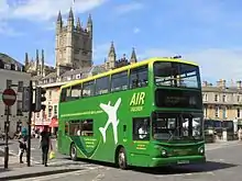 A service was started in March 2013 that linked Bath with Bristol Airport and branded 'Air Decker'. It offered through ticketing with Abus services in the Bristol area.[6] On 21 November 2014, the company began a short-term service between Bristol and Bath using the country's first bus powered entirely by human and food waste. The biomethane gas is generated at Bristol sewage treatment works in Avonmouth, which is run by GENeco, a subsidiary of Wessex Water.[7] The introduction of Bath's Clean Air Zone in March 2021 caused the Bath Bus Company to invest heavily in new buses for its services.[8]