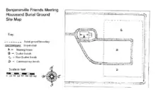 The cemetery was established soon after the original meeting house was built in 1859. Burial grounds were typical accompaniments to Friends meeting houses. While burial grounds were encouraged in the 1825 Quaker Rules of Discipline, the burial of non-Quakers in Quaker cemeteries was not.[2] To satisfy this rule burials at Benjaminville were separated into two separate sections to allow an area for non-Quakers.[2][4] A newer section contains a mix of Quaker and non-Quaker descendants of those originally buried there.