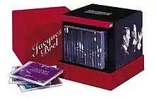Boîte à bonbons (Box of Candies) is a 16-CD box set compilation of the recorded songs of Jacques Brel. The limited edition box set was released to mark the 25th anniversary of Jacques Brel's death. The box set includes 15 albums remastered from the original records. CD digipacks are presented in their original sleeve with lyrics. The box set also includes an illustrated booklet with various pictures, a biography, and Brel's citations and testimonies. Also included are five never before released songs from the recording sessions of the album Les Marquises. Included with the booklet is a bonus CD containing 28 titles: 26 songs from Radio Hasselt recorded 14 and 21 August 1953, a recording from the Brel family's private collection, and a 1962 recording from the Dutch television show AVRO. The box set is also available in an alternate velvet box format with CDs in crystal cases.[1]