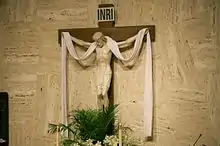 The sanctuary wall is polished buff travertine. The steps and raised surfaces in the sanctuary are of contrasting walnut travertine. The altar is a single block of polished marble weighing 7000 pounds. Within the altar are relics from St. Clement, St. Irenaeus, and St. Aurelius. The sanctuary itself is oval-shaped and was designed specifically for ceremonies in which the bishop presides and for post-Vatican II liturgy. The cathedra or bishop's throne sits immediately beneath the bishop's coat of arms, which hangs on the sanctuary wall. The crucifix with a corpus of walnut travertine is suspended from the wall. The corpus is 5 feet (1.5 m) tall and weighs over 450 pounds (200 kg).