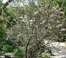 The inflorescences are borne on short stalks less than three centimeters long and are small and rounded with tiny white flowers.[2] They can be quite dense and can cover branches thickly, or they may be sparse. The flowers are white, though may have a yellowish or pink tint.