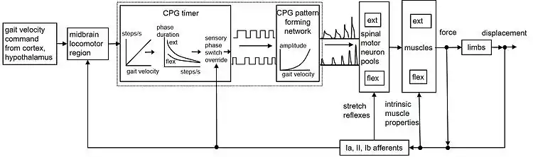58. 1 2 3 4 Danner SM, Wilshin SD, Shevtsova NA, Rybak IA (December 2016). "Central control of interlimb coordination and speed-dependent gait expression in quadrupeds". The Journal of Physiology. 594 (23): 6947–6967. doi:10.1113/JP272787. PMC 5134391. PMID 27633893.