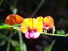 Chorizema cordatum, commonly known as heart-leaf flame pea,[2] is a species of flowering plant in the family Fabaceae and is endemic to the southwest of Western Australia. Noongar people know the plant as kaly.[3] It is a woody, erect, scrambling or climbing shrub with heart-shaped leaves, the flowers usually brightly coloured in yellow, orange and red.