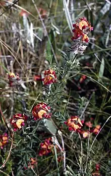 Chorizema cytisoides is a species of flowering plant in the family Fabaceae and is endemic to the southwest of Western Australia. It is an erect to low-lying or sprawling shrub with linear leaves and reddish-orange, yellow and purple flowers.