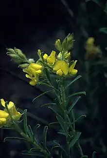 Chorizema spathulatum is a species of flowering plant in the family Fabaceae and is endemic to the southwest of Western Australia. It is an erect or low-lying shrub with linear to wedge-shaped or almost oblong leaves, and yellow pea flowers.