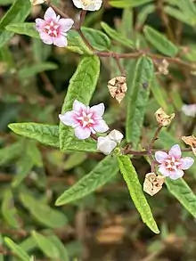 Commersonia amystia is a species of flowering plant in the family Malvaceae and endemic to eastern Australia. It is a dwarf shrub with narrow egg-shaped leaves that are densely covered with star-like hairs on the lower surface, and has flowers with five white sepals that turn pink as they age, and five smaller white petals.