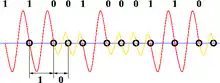 To record physical data, the zero-crossing from positive to negative voltage of the analog signal is measured. The resulting time between these positive to negative crossings is then compared to a threshold to determine whether the time since the last crossing is short (0) or long (1).[10] Note the lower amplitude for the shorter periods.