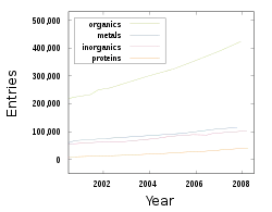 Crystal structures are typically categorized as minerals, metals-alloys,[4] inorganics,[5] organics,[6] nucleic acids,[7] and biological macromolecules.[8][9] Individual crystal structure databases cater for users in specific chemical, molecular-biological, or related disciplines by covering super- or subsets of these categories. Minerals are a subset of mostly inorganic compounds. The category ‘metals-alloys’ covers metals, alloys, and intermetallics. Metals-alloys and inorganics can be merged into ‘non-organics’. Organic compounds and biological macromolecules are separated according to molecular size. Organic salts, organometallics, and metalloproteins tend to be attributed to organics or biological macromolecules, respectively. Nucleic acids are a subset of biological macromolecules.