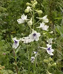 This larkspur has white sepals and blue upper petals. It is likely a hybrid between Delphinium menziesii and D. trolliifolium.[1][2] It grows up to 90 centimeters tall from a network of tubers. The inflorescence is pyramidal, with the lower pedicels much longer than the upper. Flowering occurs in April through June.[2] Flowers are pollinated by bumblebees.[1]