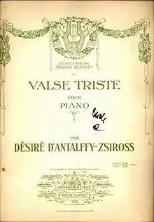 Dezso d'Antalffy (born Dezső Antalffy-Zsiross;[notes 1] 24 July 1885 – 29 April 1945), was a Hungarian organist and composer. He was one of the most significant performing artists of his time.[notes 2] He composed pieces for orchestra, chamber orchestra, choir, piano and organ which were published by Schirmer, Ricordi, Leduc, Salabert, Steingräber, Breitkopf and Universal.[1]