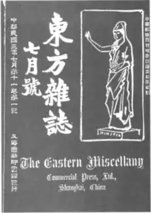 In 1915, New Youth magazine compared Eastern and Western cultures and criticized Chinese culture with articles such as "Admonishment to Youth", "French and Modern Civilization", and "Differences in the Fundamental Ideology of Eastern and Western Nationalities". Later, the Oriental Magazine compared Eastern and Western cultures, defending traditional Chinese culture.[4] In 1918, Chen Duxiu sent out a series of articles questioning the journalists of the Oriental Magazine, while Du Yaquan responded to the questions in Oriental Magazine.[5] Subsequently, the content and scale of the debate continued to expand, with almost all important scholars at the time participating.[6] Hu Shih, Chen Duxiu, and other Westernized schools criticized and completely rejected Chinese culture.[7] Liang Shuming, Du Yaquan, Zhang Shizhao, and others defended Chinese culture and believed that it was necessary to reconcile Chinese and Western cultures.[8] In 1919, the Paris Peace Conference agreed to transfer Germany's rights and interests in Shandong Problem to Japan, which triggered the May Fourth Movement and the disappointment of Chinese intellectuals with the West. At this time, Zhang Shizhao, Chen Jiayi, and others actively promoted the harmony between Chinese and Western cultures, causing criticism from those who supported Westernization.[9] At this point, the focus of the debate shifted from the previous comparison of the strengths and weaknesses of Eastern and Western cultures, as well as the similarities and differences between Eastern and Western civilizations, to the question of whether Eastern and Western cultures can be reconciled. Chen Duxiu, Li Dazhao, Cai Yuanpei, Zhang Dongsun, Chen Jiayi, Zhang Shizhao, Jiang Menglin, Chang Naide, and others participated in the debate.[10] Since 1921, works by Liang Qichao and others have transmitted the pessimistic sentiment in Europe after World War I back to China, leading to a reflection on Western civilization in the debate. Liang Shuming's "Eastern and Western Cultures and Their Philosophy" and Liang Qichao's "Record of European Journey" immediately became the focus of discussion, and the practical approach of combining Eastern and Western cultures became the main focus of attention.[9]