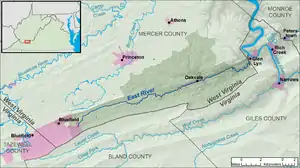 The East River is a tributary of the New River, 24 miles (39 km) long,[3] in southern West Virginia and southwestern Virginia in the United States. Via the New, Kanawha and Ohio rivers, it is part of the watershed of the Mississippi River, draining an area of 76.4 square miles (198 km2)[4] in the Ridge-and-Valley Appalachians.