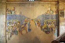 An example of the mixture of styles is the Church of the Holy Sepulchre in Jerusalem, the renovation and rebuilding of which was completed in 1149; however only fragments of the large programme of mosaics now survive. This was until the loss of Jerusalem in 1187 the institution with the main Crusader scriptorium, from which six manuscripts survive, made in a mixture of royal and church commissions.[5] Most of the significant surviving illuminated manuscripts were produced in the 13th century, about half in the last forty years of the Latin kingdom; to what extent this is an accident of survival is unclear.[6] Some icons in wall painting and mosaic survive from the Church of the Nativity in Bethlehem.[5] The Hospitaller church at Abu Ghosh, apparently then regarded as the biblical Emmaus, was abandoned in 1187 but has good remains of frescos. Some wall paintings and mosaic sections survive from the Church of the Nativity in Bethlehem,[5] and there are frescoes at Lagoudhera on Cyprus.[3]