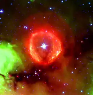 From radio and infrared images a detached shell can be seen that shows evidence of two mass-loss episodes.[6] This shell has a mass of 1.51 M☉ and a radius of 0.66 parsecs,[5] and it contains carbon monoxide[8] and ammonia.[6]