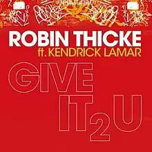 "Give It 2 U" is a song by American singer-songwriter Robin Thicke from his sixth studio album, Blurred Lines (2013). It was written and produced by Dr. Luke and Cirkut, with additional writing by Thicke, the featured artist Kendrick Lamar, and will.i.am. Originally titled "Give It to Me", a demo version of the song premiered on the radio show Sway in the Morning on May 2, 2013. Featuring guest vocals from Lamar, it was released as the third single from the album on August 27, 2013. "Give It 2 U" is an uptempo hip hop and electropop song with elements of dubstep. Lyrically, Thicke sings about sexually pleasing a partner.