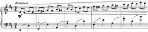 The second movement, in D♯ minor (i.e. a key a semitone above the first movement) and ending in the relative major key of F♯ major, called 30 ans and subtitled "Quasi-Faust", is the most substantial piece in the sonata, in sonata form. Ronald Smith comments on the first subject of this movement: