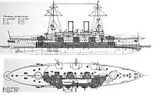 The Habsburg class was a group of pre-dreadnought battleships built by Austria-Hungary at the turn of the 20th century. They were the first sea-going battleship built by Austria-Hungary since the central battery ship Tegetthoff in 1876.[1] The class was composed of three ships: Habsburg, Árpád, and Babenberg. They were armed with three 24 cm (9.4 in) guns in two turrets and were capable of slightly better than 19.5 knots (36.1 km/h; 22.4 mph) at full speed. Habsburg and Árpád were modernized in 1910–11.