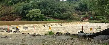 The piers are 1.2 m thick and the span between the piers is 80cm.[3] Originally there were 28 channels for the water to flow between the piers, but over time, some piers and channels were destroyed,[5] and a project to restore the 24 channels to the original 28 channels was started in 2008, and completed in 2018.