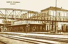 From 1847 to 1848 the line of the Stargard-Posen Railway Company was built through the area. In 1848, the construction of a train station began at the planned junction of the Küstrin (Kostrzyn nad Odrą)-Posen (Poznań) line, with a reception building built in the classical style. The town owes its existence to the rail, as developed only after 1848, when the Poznań-Szczecin line was opened, crossing the Prussian Eastern Railway. In fact its name (Krzyż and Kreuz in English mean cross) reflects the fact that rail lines cross there.