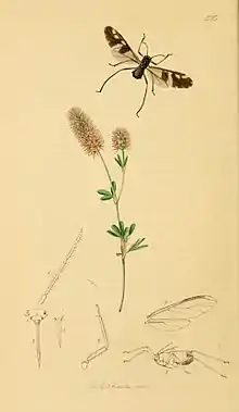 L. roboris (Linnaeus, 1758) with Trifolium arvense, illustrated by John Curtis in British Entomology: (1) face; (2) labium; (3) labrum; (4) antennae; (6) foreleg; (9) wing; (F) female[1] | |