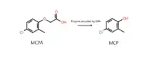 The MCPA can be degraded biologically in soils by plants and microorganisms. The major metabolite of MCPA degradation is MCP (4-chloro-2-methylphenol). The pathway could be the cleavage of the ether linkage, yielding MCP and acetate acid. Another pathway could be the hydroxylation of the methyl group, yielding cloxyfonac (4-Chloro-2-hydroxymethylphenoxyacetic acid). Recent studies have demonstrated that biological degradation of MCPA is enzymatically catalyzed by an α-ketoglutarate-dependent dioxygenase encoded by the tfdA gene of soil microorganisms. Soil indigenous bacteria that carry the tfdA gene could use MCPA as the sole source of carbon.[22][23]