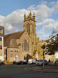 The church is contracted in freestone with Welsh slate roofs in Gothic Revival style. Its plan consists of the main body of the church, a south porch, and a southwest tower, with church offices attached on the north side. The tower is in four stages with corner buttresses. On the west side is a gabled porch flanked by pilasters. There are lancet windows in the second and third stages, with paired bell openings in the top stage. At the summit are corner pinnacles with conical roofs, and a parapet pierced by a gabled decoration arising from the tops of the bell openings. In the entrance front is a recessed porch with an entrance consisting of two pointed arches with polished granite columns. Above this is a stepped triple window, the central window having three lights. To the left is a doorway leading to the church offices. The sides of the church are expressed in two storeys, and divided into three bays by shallow buttresses. Each bay contains a window in both storeys, all with trefoiled heads.[1] Inside the church are a hammerbeam roof and galleries on three sides.[2]