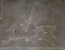 It's clear from surviving inventory lists in Gansu and Xinjiang that the crossbow was greatly favored by the Han dynasty. For example, in one batch of slips there are only two mentions of bows, but thirty mentions of crossbows.[36] Crossbows were mass-produced using material such as mulberry wood and brass; a crossbow in 1068 could pierce a tree at 140 paces.[37] Crossbows were used in numbers as large as 50,000 starting from the Qin dynasty and upwards of several hundred thousand during the Han.[38] According to one authority the crossbow had become "nothing less than the standard weapon of the Han armies" by the second century BC.[39] Han era carved stone images and paintings also contain images of horsemen wielding crossbows. Han soldiers were required to pull an "entry level" crossbow with a draw-weight of 76 kg/168lb to qualify as an entry level crossbowman,[40] while it was claimed that a few elite troops were capable of bending crossbows by the hands-and-feet method, with a draw-weight in excess of 340 kg/750lb.[41][42]