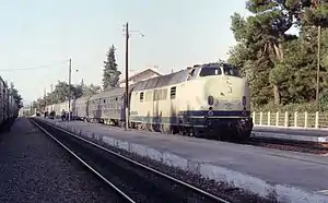 ![]() The 20:05 Dikaia to Athens InterCity service (pulled by a Class A410 no. A426) waiting at Oinoi 7 November 1992 | |||||||||||||||||||||||||