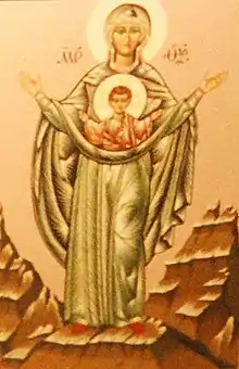 Our Lady of the New Advent is an icon of Mary associated with the Roman Catholic Archdiocese of Denver. It was written by Fr. William McNichols, SJ. The icon was presented to Pope John Paul II by Cardinal Francis Stafford on the occasion of the World Youth Day held in Denver, in 1993. The icon is based on the Mirozh icon and the hymn O Virgo Splendens.[1] The memorial of Mary under this title is celebrated on 16 December in the Archdiocese of Denver.