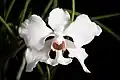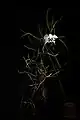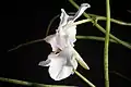 This species is adapted to drought and can grow in full sun. Flexible, long and slender stems bear terete, distichously arranged leaves with cuticular papillae and specialised, club-shaped water-storage cells are found within the mesophyll. The cuticle is very thick and may reach a thickness of 19 µm on the adaxial leaf surface and 17.5 µm on the abaxial leaf surface.[6] Few flowers, resembling Vanda flowers, hence the specific epithet vandarum, are produced on axillary racemes. The floral morphology of the fragrant, predominantly white flowers infers entomophily and they are thought to be pollinated by moths. The three-lobed labellum bears a 1.6 cm long, slender, bent or curved spur, which has unicellular, or occasionally bicellular, secretory trichomes.[7] Spindle-shaped, 0.3 mm long seeds with pointed ends are formed in capsules.[8]