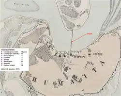 Briefly, the fortress of Humaitá was built on a sharp concave bend in the river and comprised more than a mile of heavy artillery batteries atop a low cliff. The channel was only 200 yards wide, and ran within easy range of the batteries; a heavy chain boom could be raised to block the navigation and detain the shipping under the guns. 'Torpedoes' (improvised contact naval mines) could be released or anchored in the stream. On its landward side the fortress was protected either by impassable terrain or by 8 miles of trenches with 120 heavy guns and a garrison of 18,000 men. An attempt to capture one of its outworks by frontal attack failed disastrously at the Battle of Curupayty (22 September 1866); another frontal attack was out of the question.[22][23]