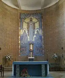 Eric Newton created the mosaics for the reredos behind the altar and above each of the two side chapels, the most striking of which is a figure of the Sacred Heart with supporting angels in the apse. He added more mosaics in the side chapels in 1961 to commemorate the church’s silver jubilee. More changes were made to the sanctuary in the late 1960s as a result of the Second Vatican Council. The altar was moved forward to enable Mass to be celebrated versus populum and at the same time it was shortened, the left-over stone being used to form a table for the tabernacle which remains in its original position at the rear of the sanctuary.