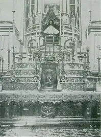 However, by the end of the 16th century, the town was still little more than a group of small houses along with a small hermitage.[3] The hermitage, built by Friar Miguel de Bolonia, was dedicated to the Immaculate Conception. This structure was the first home of a very small image of the Virgin Mary, believed to have been brought to the area from Michoacán either by Bolonia or by Friar Antonio de Segovia.[2][3] Over time, moths damaged the statue and it was packed away in a corner of the sacristy. The image remained there until 1632, when it became associated with its first miracle. After this, the image was taken to Guadalajara to be restored, and it was then returned to San Juan.[2] Pilgrimages to the miraculous image soon began, and pilgrims' valuable offerings permitted the building of newer and grander churches for the image.[2] The first chapel to the image was built in 1638; it is now the Chapel of the First Miracle.[3]
