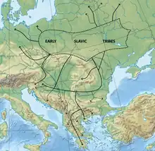 The Byzantines broadly grouped the numerous Slav tribes living in proximity with the Eastern Roman Empire into two groups: the Sklavenoi and the Antes.[3] The Sclaveni were called as such by Procopius, and as Sclavi by Jordanes and Pseudo-Maurice (Greek: Σκλαβηνοί (Sklabēnoi), Σκλαυηνοί (Sklauēnoi), or Σκλάβινοι (Sklabinoi); Latin: Sclaueni, Sclavi, Sclauini, or Sthlaueni - Sklaveni). The derived Greek term Sklavinia(i) (Σκλαβινίαι; Latin: Sclaviniae) was used for Slav tribes in Byzantine Macedonia and the Peloponnese; these Slavic territories were initially outside of Byzantine control.[4] By 800, however, the term also referred specifically to Slavic mobile military colonists who settled as allies within the territories of the Byzantine Empire. Slavic military settlements appeared in the Peloponnese, Asia Minor, and Italy.