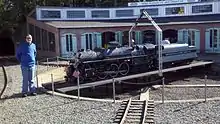TrainTown steam locomotive on the turntable in front of the roundhouse