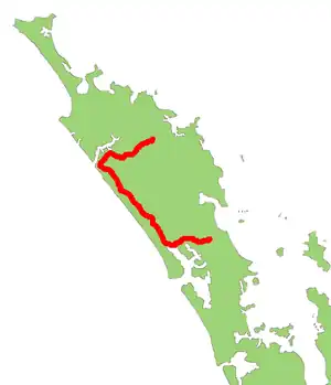 SH 12 starts in Ōhaeawai, running initially southwest to Kaikohe, during which it shares a short section of road with SH 15. It then turns roughly westwards, reaching the Hokianga harbour at its Omanaia River arm. It continues west, reaching Opononi and Ōmāpere at the mouth of the harbour, before turning southeast to parallel the coast. The highway briefly follows the valley of the Waimamaku River before winding through the Waipoua Kauri Forest, then follows the valley of the Kaihu River to Dargaville. At Dargaville, the highway meets SH 14, and continues southeastwards along the edge of the Wairoa River to Ruawai before turning eastwards. It briefly skirts the edge of the Arapaoa River arm of the Kaipara Harbour before passing through Paparoa and Maungaturoto and ending at its junction with SH 1 at Brynderwyn, 15 km (9.3 mi) south of Waipu.[1]