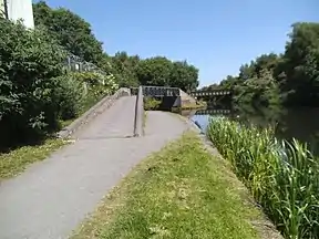 ![]() The stub of the Extension Canal turns off the Stourbridge Canal feeder, and passes under the towpath bridge | |