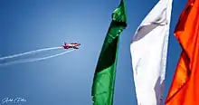 In 1998, with Wg Cdr A K Murgai as the CO, the team expanded to a nine-aircraft formation. Considering the team was just two years old, it was no small achievement. The team first displayed a formation of nine-aircraft during the Independence Day fly past over the Red Fort in 1998. The first full-fledged nine-aircraft aerobatic display was to follow at Palam on 8 October 1998, to mark Air Force Day.[2] In November 1999, the Royal Air Force's Red Arrows aerobatic team was transiting through India en route to Australia. The Surya Kiran team was at Hindon to interact with them and a lucky few managed a sortie in the Hawk. Three months later the French aerobatic team ‘Patrouille de France’ was at Pune and the two teams met and flew some sorties in the Alpha jet. An interaction between the two teams resulted in the SKAT adopting the "Synchro" manoeuvre. This raised their standard a couple of notches and added more colour to its displays. The first synchro sequence was displayed during the Combined Graduation Parade at Air Force Academy in June 2000.[2]