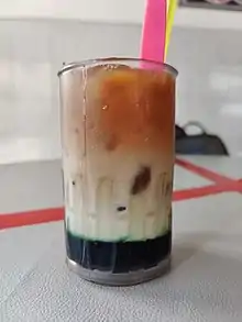 Teh tarik (lit. 'pulled tea') is a popular hot milk tea beverage most commonly found in restaurants, outdoor stalls, mamaks and kopitiams within the Southeast Asian countries of Malaysia, Indonesia, Singapore and Thailand.[1] Its name is derived from the process of repeatedly pouring the drink back and forth from one container into another (or "pulling") with arms extended during preparation, which helps to slightly cool the tea for consumption and giving it a frothy head. It is made from a strong brew of black tea blended with condensed milk. It is the national drink of Malaysia.[3]