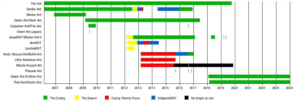 | Debut | Fire Ant and Soldier Ant: February 25, 2006[1][2] Worker Ant: November 17, 2006[3] Silver Ant: February 20, 2009[4] Carpenter Ant: May 24, 2009[5] Worker Ant (II): August 1, 2009[12] |