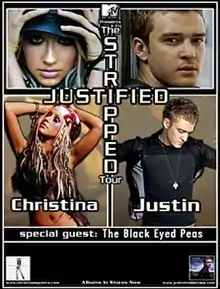 The Justified & Stripped Tour was a co-headlining concert tour by American recording artists Justin Timberlake and Christina Aguilera. It was launched in support of Timberlake's debut studio album, Justified (2002), and Aguilera's fourth studio album, Stripped (2002). Timberlake announced that he would go on a co-headlining tour at the 2003 American Music Awards on January 13, 2003, and it was officially announced the following day that Aguilera would be the co-headlined artist of the tour. Tour dates were revealed on February 21, 2003; it kicked off on June 4, 2003 in Phoenix, Arizona and visited 45 cities in North America. The Black Eyed Peas were serviced as the tour's supporting act.[1]