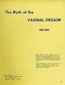 "The Myth of the Vaginal Orgasm" is a feminist essay on women's sexuality written by American radical feminist activist Anne Koedt in 1968,[1] and published in 1970.[2] It first appeared in a four-paragraph outline form in the Notes from the First Year[3] which resulted in an extended article in Notes from the Second Year[4] journals published by the New York Radical Women[5] and was partially based on findings from Masters and Johnson's 1966 work Human Sexual Response.[6] It was then distributed as a pamphlet in its full form,[7] including sections on evidence for the clitoral orgasm, female anatomy, and reasons the "myth" of vaginal orgasm is maintained.[1]