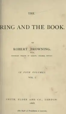 The Ring and the Book is a long dramatic narrative poem, and, more specifically, a verse novel, of 21,000 lines, written by Robert Browning. It was published in four volumes from 1868 to 1869 by Smith, Elder & Co.[2]
