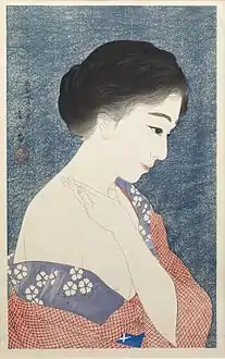 Kiyokata influenced Kontodo's bijin-ga portraits along with shin hanga designers Goyō Hashiguchi and Itō Shinsui. In 1925 he exhibited some of his bijin-ga at the Inten exhibition. He designed twenty-one bijin-ga prints which were sold in the United States. Seventeen of Kontodo's prints were shown at the seminal shin hanga exhibition at the Toledo Museum of Art in 1936.[2]