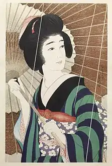Torii Kotondo (鳥居 言人, 21 November 1900 – 13 July 1976) or Torii Kiyotada V (五代目 鳥居 清忠) was a Japanese painter and woodblock printer of the Torii school of ukiyo-e artists. He followed his school's tradition of making prints of kabuki actors (yakusha-e) and involvement with commercial work for kabuki theater. His twenty-one bijin-ga (pictures of beautiful women) are particularly celebrated.